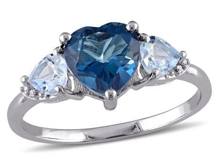 Celebrate your love with this trendsetting Amour Collection London and Sky-Blue Topaz and Diamond-Accent Three-Stone Heart Ring. This piece is perfect if your loved one has a special place in their heart for pieces that stand out. Crafted in glowing sterling silver, this ring features three beautiful heart-cut, prong-set London and sky-blue topaz gemstones (7 x 7mm). It is encompassed by an accent of six round-cut, pave-set twinkling diamonds (H-I, I3). Enhanced with a high-polish finish, this gemstone and diamond-accent ring is a valuable addition to any jewelry collection.