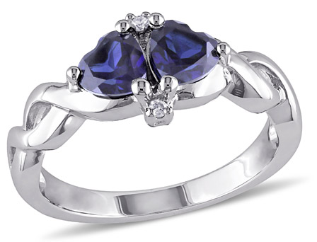 Let this beautiful Amour Collection Created Blue Sapphire and Diamond Heart Engagement Ring express your true love for her. Crafted in lustrous sterling silver, this ring features heart-cut (5mm) created blue sapphire gemstones at the center and two round-cut, prong-set diamond accents (G-H, I2-I3) along the band. This ring is enhanced with a high polish finish.
