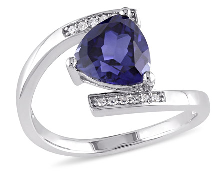 Impress your loved ones with this gorgeous Amour Collection Created Blue Sapphire and Diamond Bypass Engagement Ring. Crafted in lustrous sterling silver, this pretty ring features a trilliant-cut (8mm) created blue sapphire gemstone at the center with 12 round-cut, pave-set white diamond accents (G-H, I2-I3) along the sides. This ring is enhanced with a high polish finish.