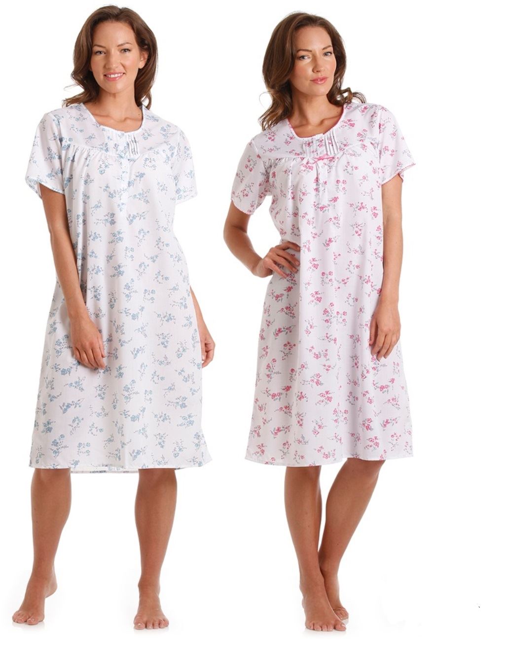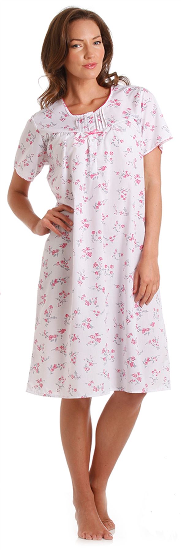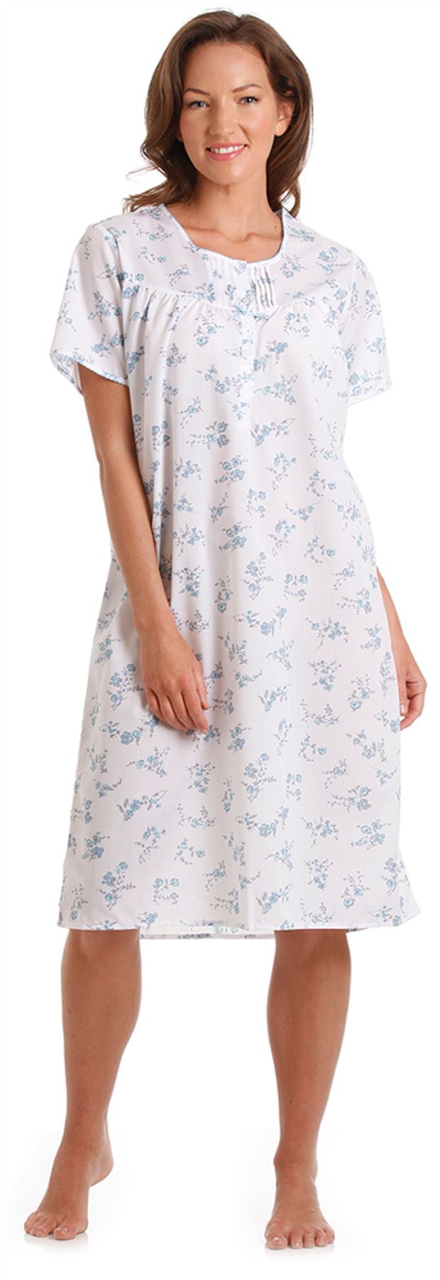Ladies Polycotton Nightdress. Short Sleeved, Round Neck with Button Neck Opening.