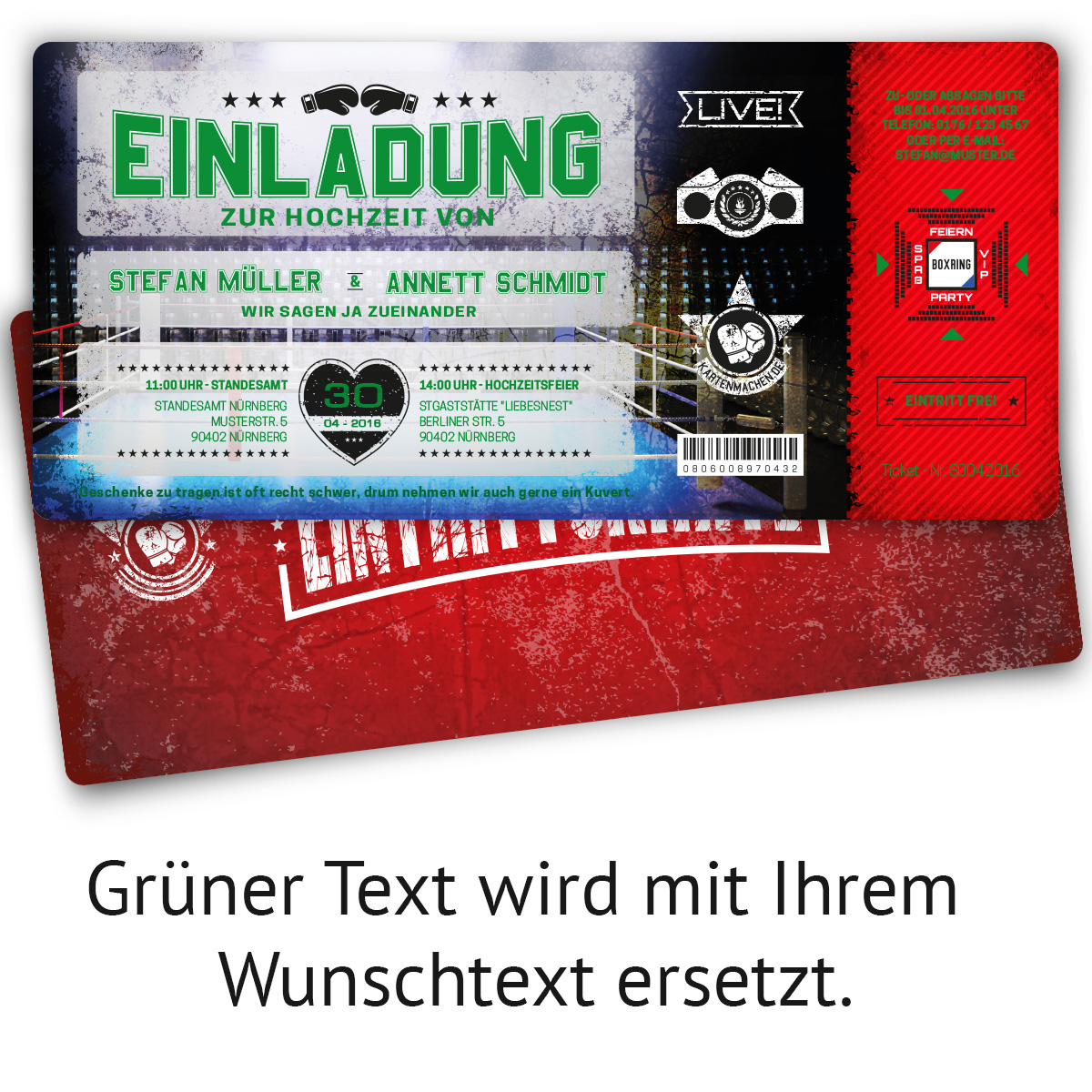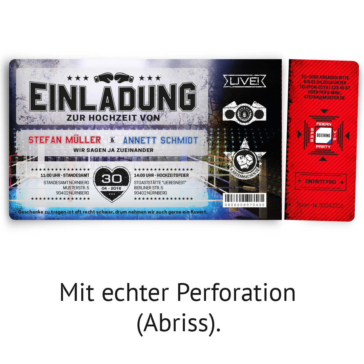 Diese Einladungskarten sind in einem Box Kampf Eintrittskarten Motiv. Die Karten sind hauptsächlich Rot (wie typische Boxhandschuhe). Ihr Text kommt auf die Vorderseite und ersetzt das Muster. Die Namen werden dabei in zwei verschiedenen Farben geschrieben (Blau und Rot). Dies erinnert an die "blaue Ecke" und "rote Ecke" bei Boxkämpfen. Die Karten besitzen einen echten Abriss (Perforation) - somit können die Karten auch als echte Eintrittskarten für Ihre Hochzeit benutzt werden. Die Gäste kommen nur hinein, wenn sie die Karte vorzeigen.