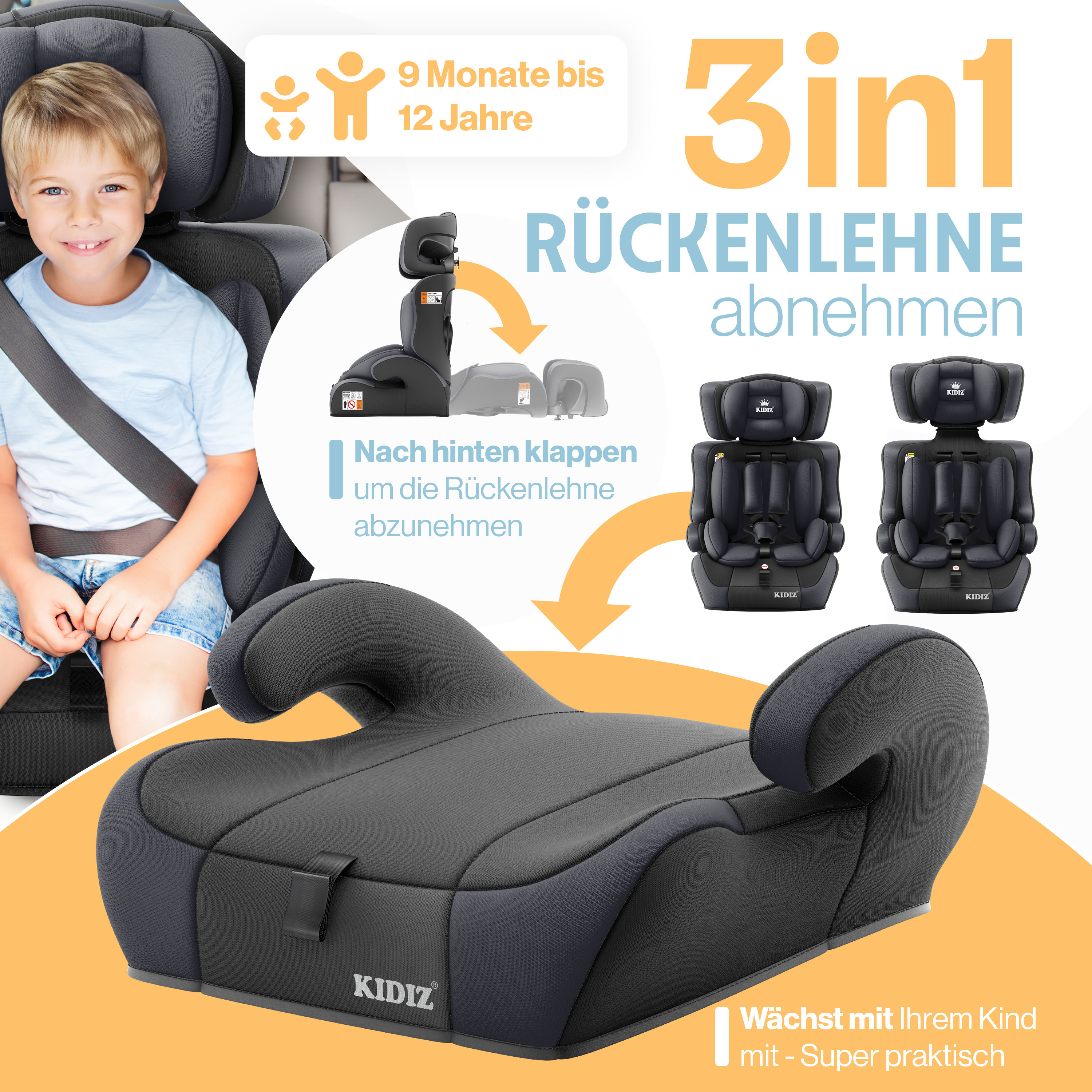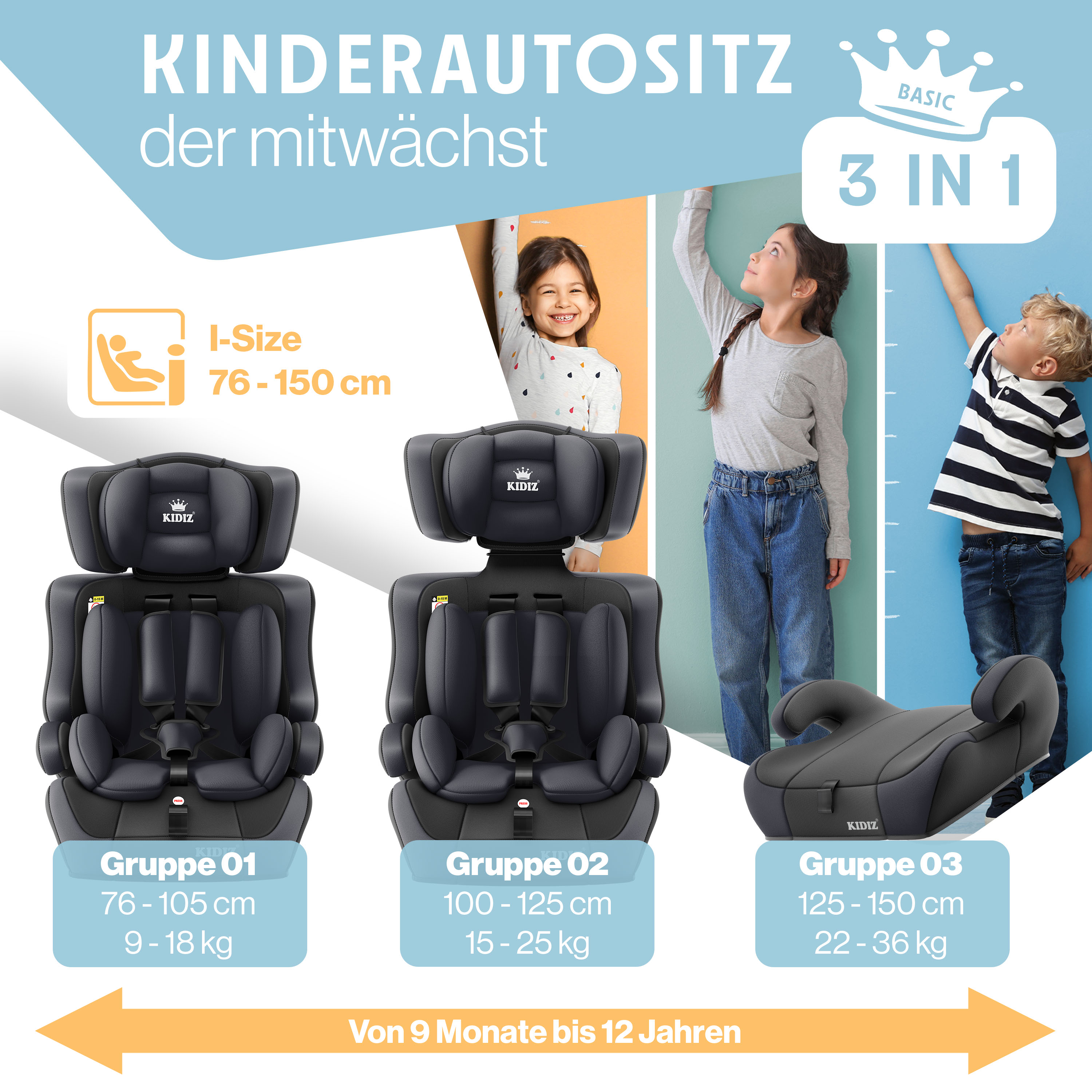 MITWACHSEND: Mitwachsender Kindersitz - Der Neue Autokindersitz von KIDIZ wächst mit Ihrem Kind mit. Durch die lange Verwendungsdauer und die höhenverstellbare Rückenlehne deckt unser Kinderautositz alle Altersstufen von ca. 1 bis 12 Jahren (Ende der Autositzpflicht) ab.