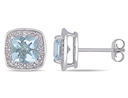 Get a sophisticated look for the upcoming premium party with these opulent Amour Collection Aquamarine & Diamond Halo Stud Earrings. Crafted in shimmering white gold, these glamorous earrings feature two cushion-cut, prong set, aquamarine gemstones (6x6mm) at the center surrounded by 24 round-cut, pave-set, diamonds (G-H-I, I2-I3). Polished to brilliance, these feminine earrings are secured with butterfly closures. A perfect gift to shower some love on yourself.