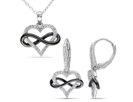 A perfect gift for your loved one, this beautiful Amour Collection Diamond Set of Infinity Heart Pendant and Earrings. Crafted in two-tone sterling silver, this lovely jewelry set features 40 round-cut, prong-set white diamonds (G-H, I2-I3). The 18-inch Cable chain pendant is secured with a spring ring clasp. The earrings are secured with leverback closures.