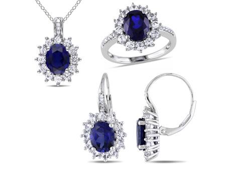 Treat yourself or someone you love with this Amour Collection Created Blue and Created White Sapphire and Diamond-Accent Earrings, Pendant, and Ring Set crafted in Sterling Silver. The leverback earrings feature 2 oval-cut, prong-set created blue sapphire gemstones, with halos consisting of 24 round-cut, prong-set created white sapphires, and 8 round-cut, pave-set diamond (G-H, I3) accents. The pendant features one oval-cut, prong-set created blue sapphire haloed by 12 round-cut, prong-set created white sapphires and enhance with 4 round-cut, pave-set diamonds, and hangs on an 18-inch chain that secures with a spring ring clasp. The matching cocktail ring completes the set with an oval-cut, prong-set created blue sapphire, 12 round-cut, prong-set created white sapphires, and 12 round-cut, pave-set diamonds. This three-piece jewelry set makes an ideal September birthstone gift.