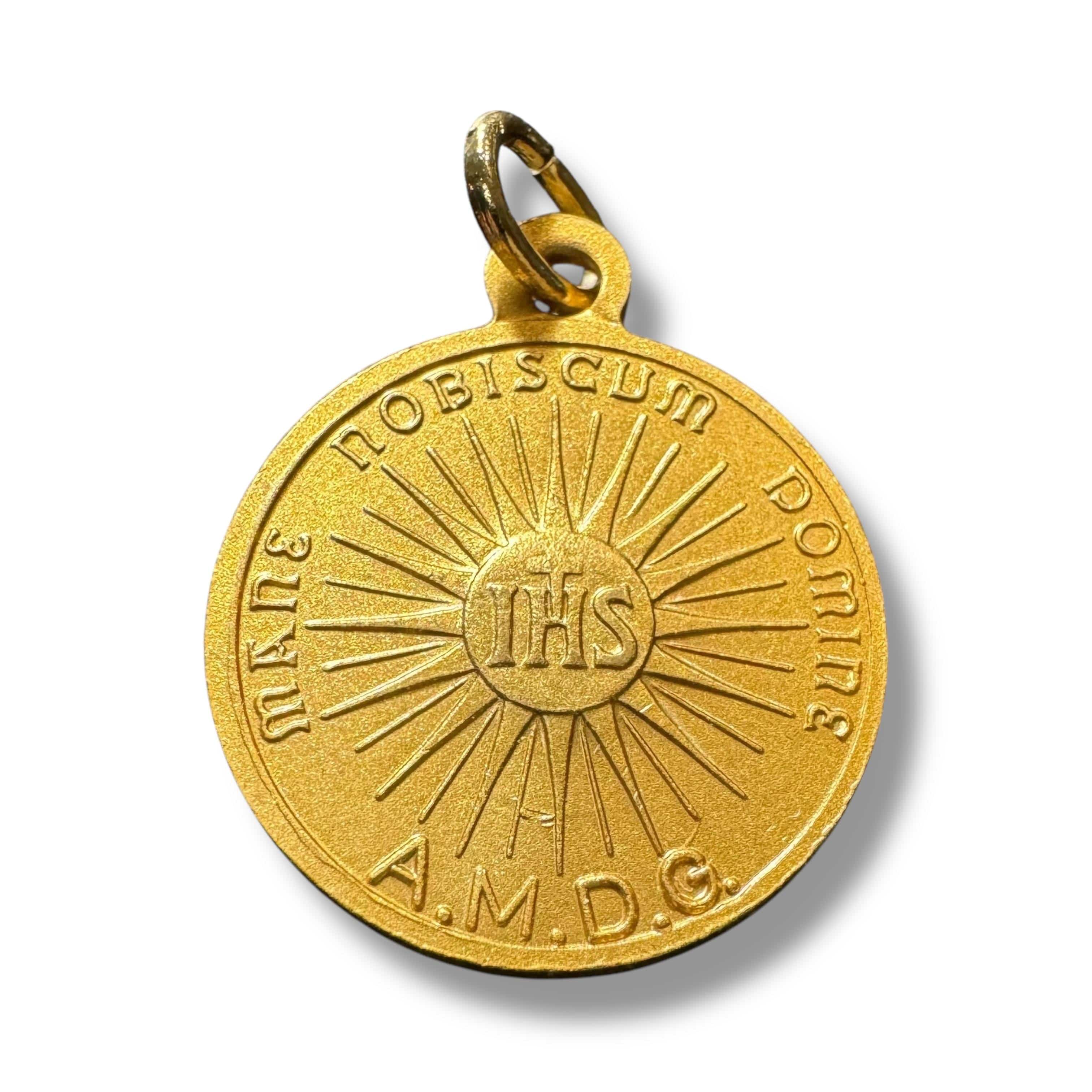 On the reverse side, the medal bears the radiant IHS Christogram, representing the Holy Name of Jesus, surrounded by the inscription "Mane Nobiscum Domine" ("Stay with us, O Lord"). This calls to mind the real presence of Christ in the Eucharist, inviting the wearer to remain close to Him in prayer and adoration. The letters AMDG (Ad Maiorem Dei Gloriam - "For the Greater Glory of God") further emphasize a life dedicated to God.