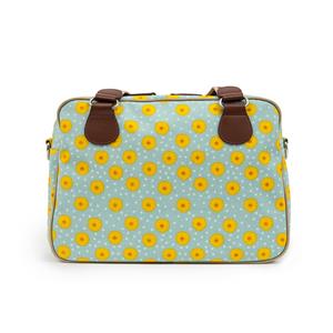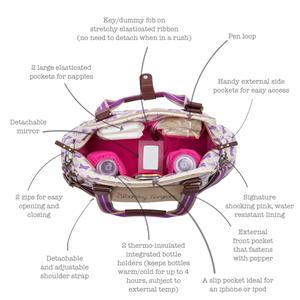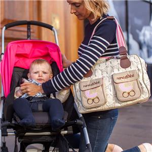 The gorgeous Mama Et Bebe changing bag, combines fashion with functionality. Feel like you have just stepped off the plane from Paris with the gorgeous Mama et Bebe slogan. This bag features the Sunflower print and is the creme de la creme of designer changing bags! On the exterior of the bag there are two front canvas pockets with the mama et bebe slogan and a pram patch in the body fabric. The bag comes with an adjustable shoulder strap that is long enough to fit over any pram/buggy handle bars. Internal Features: 2x insulated bottle holders, 2x nappy pockets, pen holder, key fob, mirror, phone pocket, small zip pocket, padded changing mat and wet zip bag.