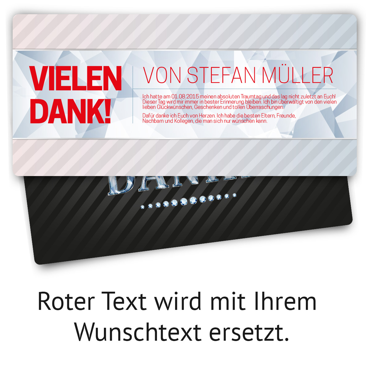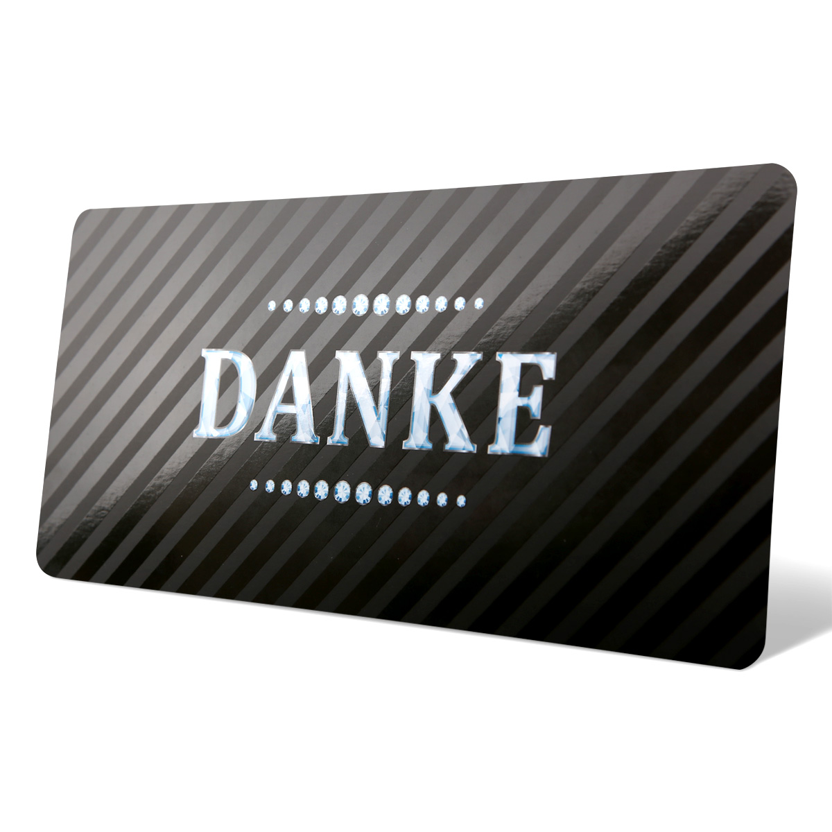 Diese Danksagungskarten sind in einem edlen VIP Design. Farblich sind diese in Schwarz und Blautönen (Diamantenoptik). Diese Danksagungskarten passen sehr gut zu unseren Einladungskarten im VIP Design. Auf die Vorderseite kommt Ihr Wunschtext und ersetzt dabei das Muster. Auf der Rückseite steht in einer Illustration "Danke". Zudem ist die Rückseite mit UV-Lack bedruckt.