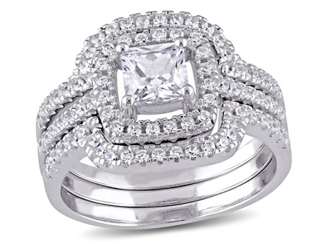 Make the dreamiest day of her life special with this glamorous Amour Collection Halo Bridal Ring Set. Crafted in shimmering sterling silver, this enchanting ring features a square-cut cubic zirconia gemstone (5x5mm) at the center surrounded by 82 round-cut cubic zirconia gemstones (1.25x1.25mm) that slide half way down the three bands. Polished to a brilliant shine, this exquisite ring will be a hope for every lover.