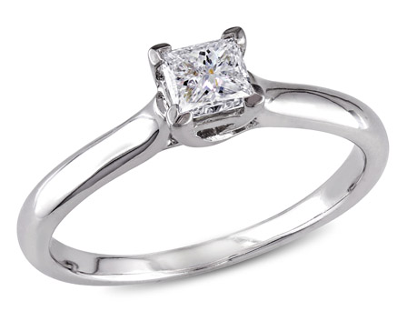 Simple and sleek, this Amour Collection Diamond Solitaire Engagement Ring is crafted in lustrous white gold. The ring features a princess-cut, prong-set white diamond (G-H, I1-I2). This ring is enhanced with a high polish finish. The diamond is certified ensuring this ring is as valuable as it is beautiful.