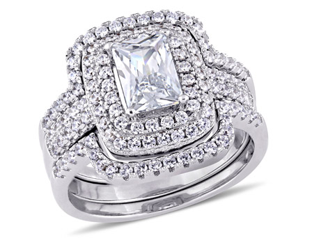 Celebrate the big day with a magnificent ring like this Amour Collection Halo Bridal Ring Set. Crafted in sparkling sterling silver, this opulent ring showcases an emerald-cut cubic zirconia gemstone (7x5mm) at the center surrounded by 116 round-cut cubic zirconia gemstones (1.25x1.25mm) that slide half way down the three bands. Polished to brilliance, this ravishing ring will perfectly compliment your bride's flawless look.