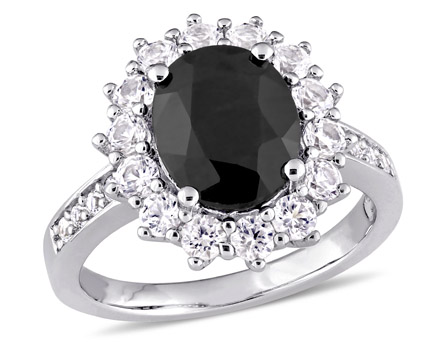 Express your style with this precious Amour Collection Black Sapphire and Created White Sapphire Halo Ring. Crafted in twinkling sterling silver, it features an oval-cut, prong-set black sapphire gemstone (10 x 8mm) at the center enhanced by a halo of 22 round-cut, prong-set dazzling created white sapphire gemstones studded around the center stone. Polished to a brilliant shine, this trendsetting gemstone ring will give you a bold and glamorous look wherever you go.