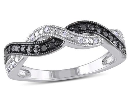 This stunning Black and White Diamond Cross-Over Ring will lend an eye-catching touch of sparkle to your look. Crafted in sterling silver, this ring features a total of 6 round-cut, pave-set black diamond accents and 9 round-cut, pave-set white diamond accents (G-H, I2-I3) shimmering along the band. This ring is enhanced with a high polish finish.
