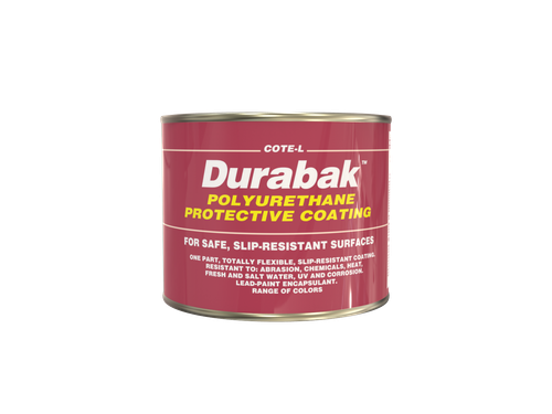 DURABAK™ is a tough, single-pack, totally flexible, slip-resistant, waterproof protective polyurethane coating with self-contained recycled rubber granules for an attractive tough-textured finish. When exposed to atmospheric moisture, DURABAK™ undergoes a chemical curing process which changes it from a liquid to a tough polyurethane membrane. It has excellent abrasion and chemical resistance. It is also available in a smooth version without the rubber granules. Both DURABAK™ (aromatic version) and DURABAK 18™ (aliphatic version) may be used for indoor and outdoor applications. However, as DURABAK™ may experience some degree of fade in outdoor applications, DURABAK 18™ is recommended for maximum UV protection under these conditions. DURABAK™ will chemically bond to most clean and dry surfaces. These include, but are not limited to, concrete, wood, fiberglass, metal, rubber and sound-painted materials. Some metal and extremely porous surfaces may need to be primed. DURABAK™ can be applied by roller, brush or spray. DURABAK™ can give a relatively smooth or rough surface, depending on application technique.