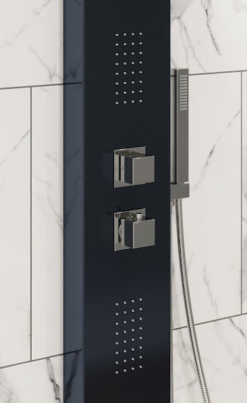 The two controls on this shower tower control your water temperature and flow separately, featuring a modern square design finished in a dazzling chrome. The chrome controls contrast beautifully against the bold black finish of the shower tower.