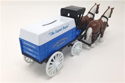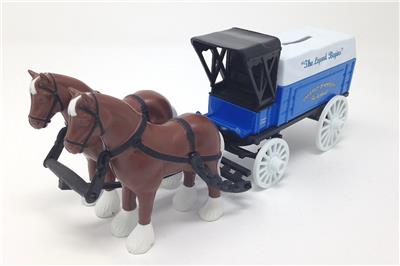 Features: Die Cast Metal Draft Horses, Die Cast Wagon, and Rolling Spoked Wheels