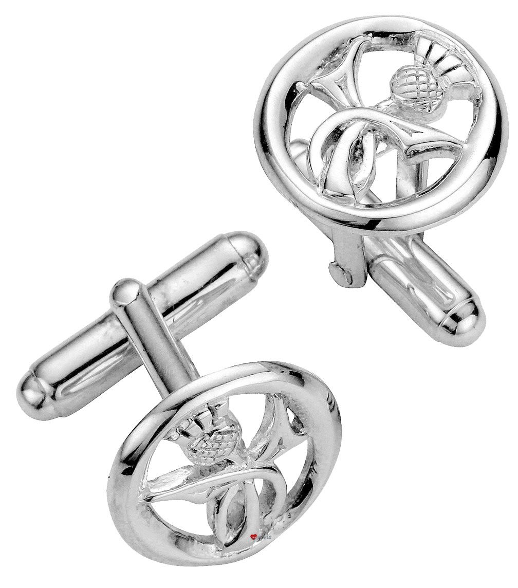 Cufflinks in Sterling Silver Round with Framed Scottish Thistle in Pierced Open Design