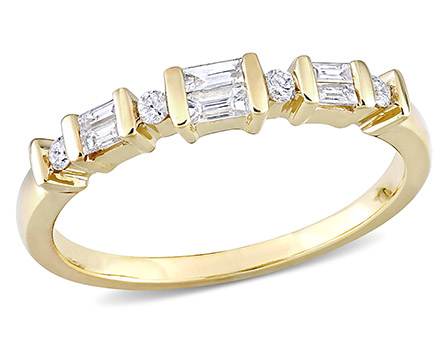 This stunning ring radiates true class and elegance. It features round and baguette diamonds (1/4 carat T.W.) crafted in 10kt yellow gold.