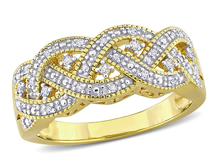 Get the perfect afternoon look with this stylish Amour Collection Braided Ring. Crafted in luminous yellow gold flash plated sterling silver, this captivating ring features seven round-cut, prong-set and 19 round-cut, pave-set diamonds (H-I, I3) entwined in a braid like pattern. Enhanced with a high polished finish, this flawless ring will add sparkle to any outfit.