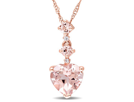 Enhance your natural elegance with this graceful Amour Collection Morganite and Diamond-Accent Pendant. Crafted in luminous rose gold, this pendant features one heart-cut, prong-set glittering morganite gemstone (7 x 7mm) as the center piece along with two round-cut, prong-set morganite gemstones and two round-cut, prong-set shimmering diamonds (G-H, l1) resting above it. Enhanced with a high polish finish, this gemstone and diamond pendant is a great accessory to add a touch of glamour to any ensemble. Suspended on a 17-inch, it secures with a spring ring clasp.