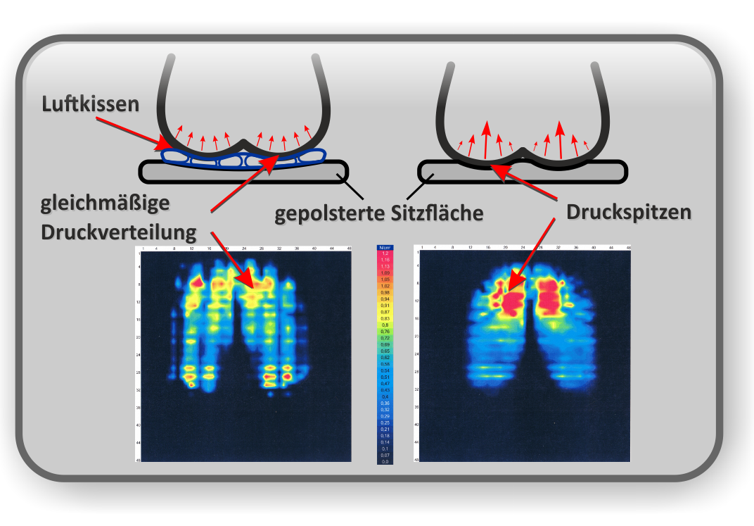 Während die einseitige Belastung bei Sitzpolstern aus Weichschaum den Druck an der Stützseite enorm erhöht, bleibt die Druckverteilung bei Luftkissen fast unverändert konstant.