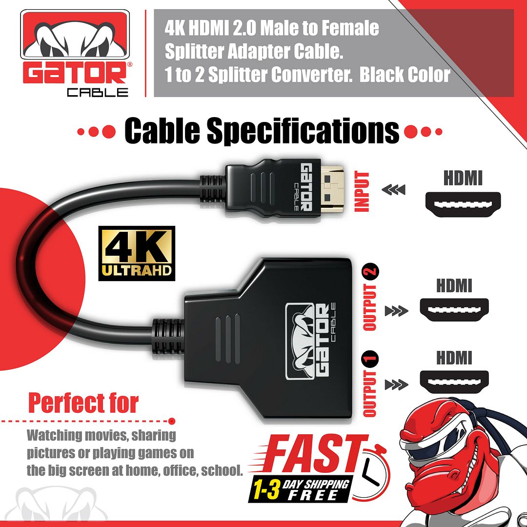 ![]() Gator Cable 4K HDMI 2.0 Male to Female Splitter Switch Adapter 1 to 2 HDMI Splitter Switch Converter Specifications: Cable Jacket: Black Flexible PVC Material: ABS Casing Color: Black Gold Plated Connectors 24K 9.5 Inches Length Converts One HDMI 2.0 to Two Splitter Durable Heavy Duty ABS Construction 4K Resolution Max resolution is 2160P at 240MHz Bandwidth Speed 18Gbps Dolby 7.2 HDMI version 2.0 compliant and HDCP compliant Input resolution: 720P/1080I/1080P/2160P 4K Please Note: This device is an HDMI Splitter/Switch |