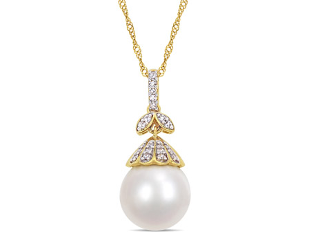 Be admired for your distinct sense of fashion when you wear this Amour Collection South Sea Cultured Pearl and Diamond Drop Pendant. Crafted in sparkling yellow gold, it features one drop-shaped, white, gleaming South Sea cultured pearl (10-11mm), along with 21 round-cut, pave and buttercup-set shimmering diamonds (G-H, I1-I2). Suspended on a 17-inch chain, this pendant secures with a spring ring clasp. This pearl and diamond pendant makes the perfect choice for someone you love.