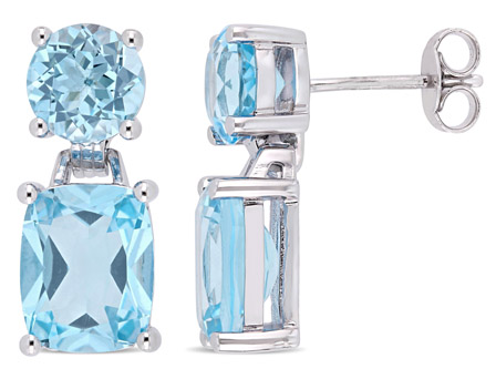 Add sparkle to your look with these sumptuous Amour Collection Sky Blue Topaz Drop Earrings. Mounted in flickering sterling silver, they feature two round-cut and two cushion-cut, prong-set sky-blue topaz gemstones (10 x 8mm) (7 x 7mm). Enhanced with a high polish finish, these marvelous gemstone dangle earrings secure with butterfly closures. Pair these eye-catching gemstone earrings with any ensemble for a polished colorful look.