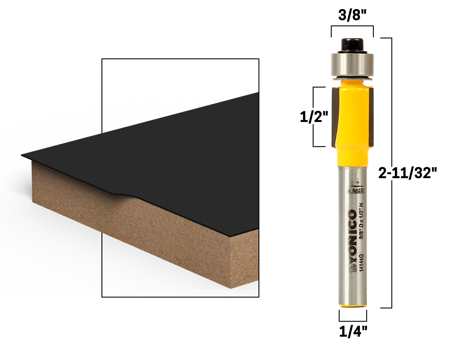 This laminate flush trim bit has a 3/8" cutting length and a 1/2" diameter. The overall length is 2-11/32" with a 1/4" shank.