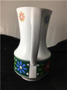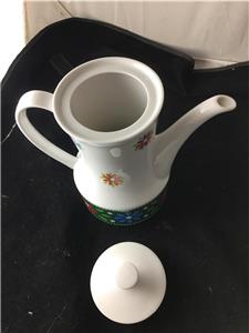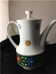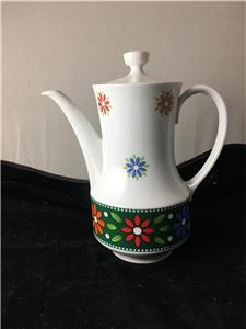 Here is a teapot made by Seltmann Weiden fron Bavaria, the teapot is marked Anja and is numbered 2039 16. The teapot has a mod type daisy design on it. The teapot is in excellent condition free of chips or cracks and stands about 9" high to the top of the lid and is about 8" from handle to spout.