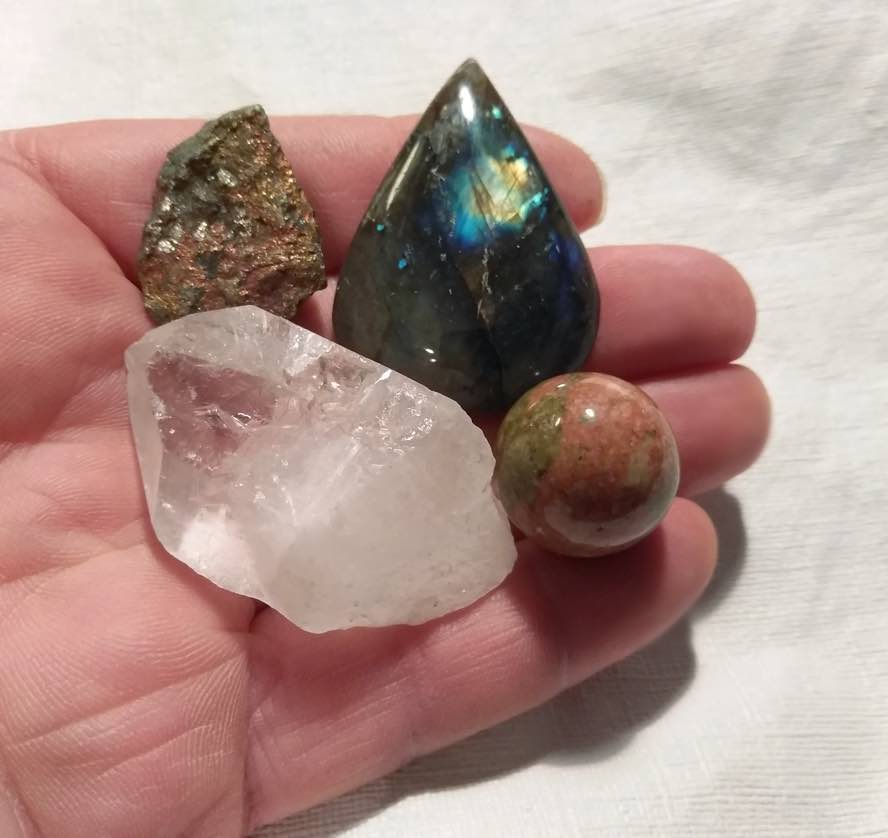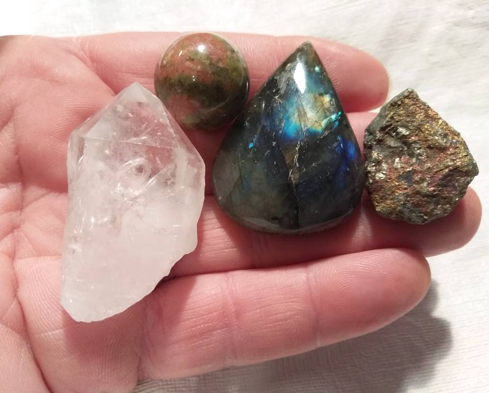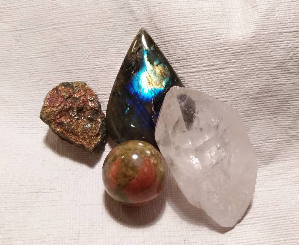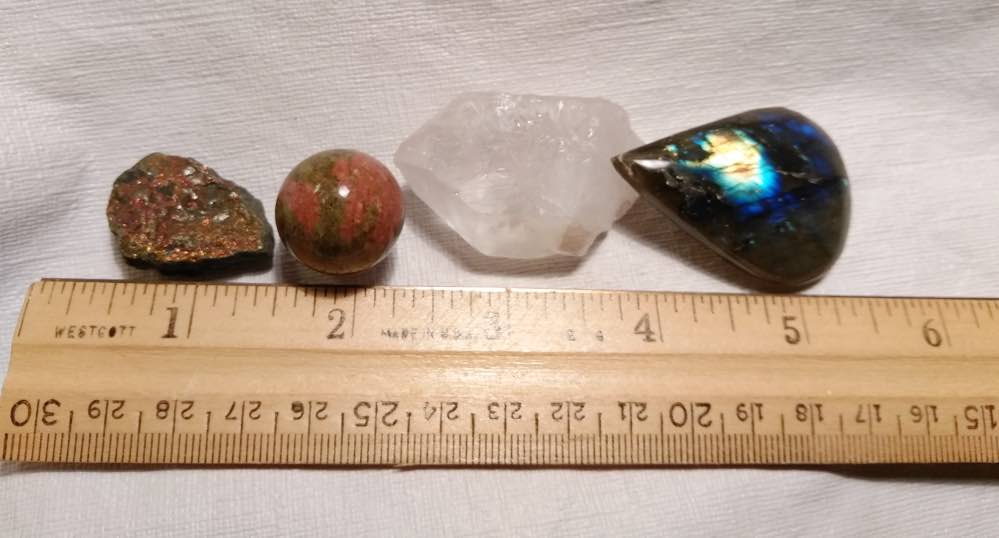 4 Cool Stones - Labradorite Cabochon, Quartz Crystal Point Bornite Peacock Pyrite Stone, Unakite Sphere These are lovely stones, and the exact ones you will receive. The quartz has some small chips but is still a very nice crystal. We include a small crystal, stone or glass gift.