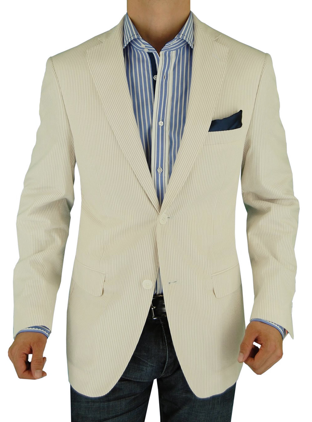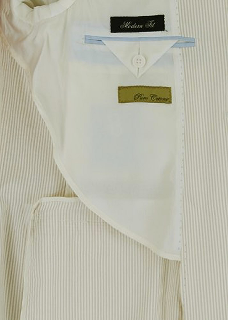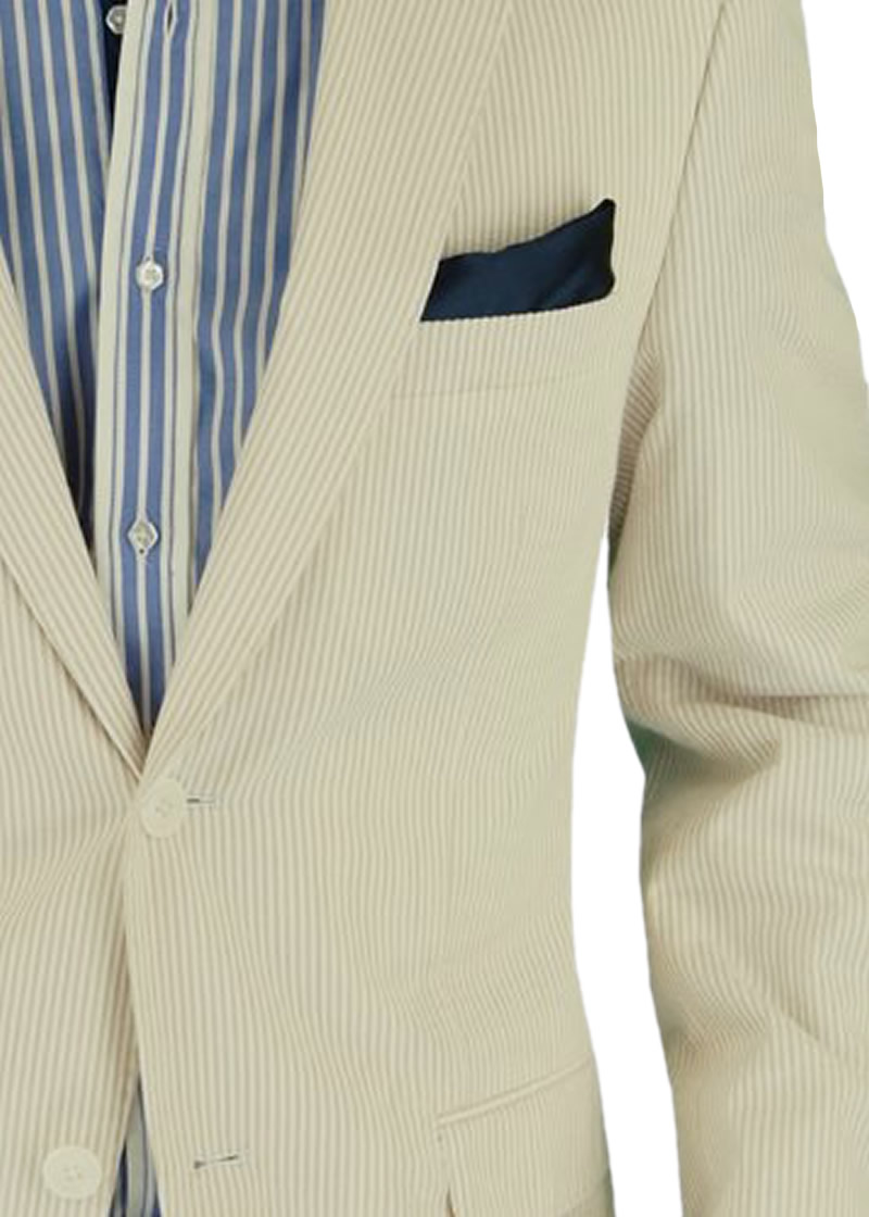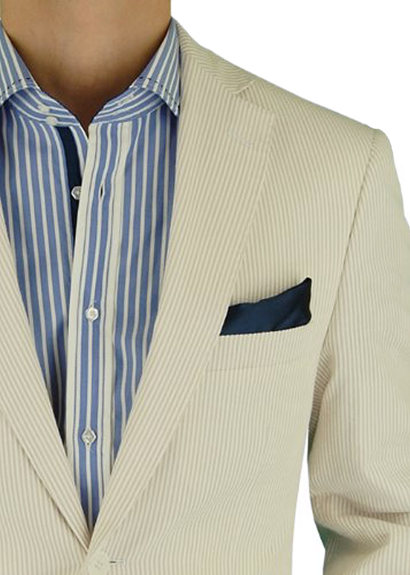 Cotton Stretch Suit. Dress up your denim or dress pants with this Seersucker blazer featuring two button closure. JACKET: 2 button, single breasted, dual side vents, 3 pockets 2 with flaps, lapel notched, 4-button vented sleeves with working buttonholes. Top quality half lining. Hand Tailored. - Constructed with the finest detailing and highest quality with top finishing. Dry Clean Only, Imported, Made in Italy