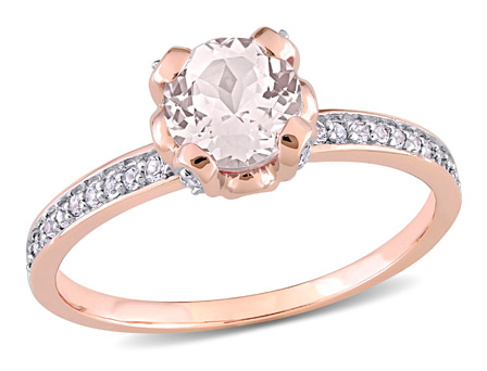 This dainty morganite and white topaz floral halo engagement ring from the Amour Collection is crafted in crafted in rose gold and features a round-cut, bezel-set morganite at its center with 34 round-cut, pave-set white topaz gemstones studded along its slender band. Whether worn as an engagement ring or simply a gorgeous gemstone piece, this ring is sure to make a standout addition to any jewelry collection. Choose this stunning piece either for yourself or for someone you love.