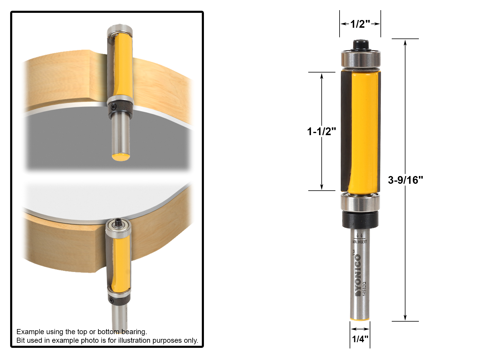 Top and bottom bearing flush trim bits are used to trim the edges of wood stock that have sections of tricky end grain which are subject to tear out. The direction of cut will significantly effect the results. Having the option to use either the top or bottom bearing as a trim guide will give you the option to flip the workpiece and either ramp or climb the woodgrain. As with all trim bits, choosing the largest diameter that will accommodate your workpiece will yield the smoothest finish.