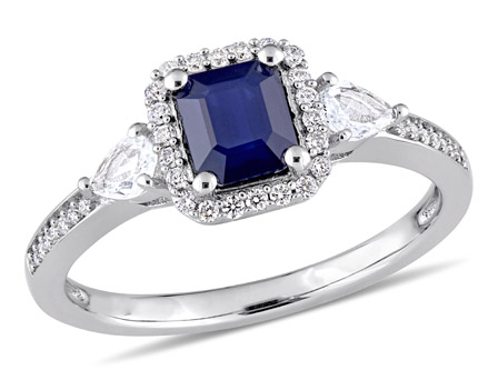 Show your love with this luxurious Amour Collection White and Blue Sapphire and Diamond Engagement Ring. Mounted in lustrous white gold, this ring features an octagon-cut, prong-set gleaming blue sapphire gemstone (6 x 4mm) in the center, with a pear-cut, prong-set glittering white sapphire gemstone on each side, and 36 round-cut, prong and pave-set shimmering diamonds (G-H, I1-I2) forming a halo and resting along the band. This elegant ring is just what you have been looking for on your special day to make it a memorable one. Enhanced with a high polish finish, this classic gemstone and diamond engagement ring will surely make a valuable addition to your jewelry collection.