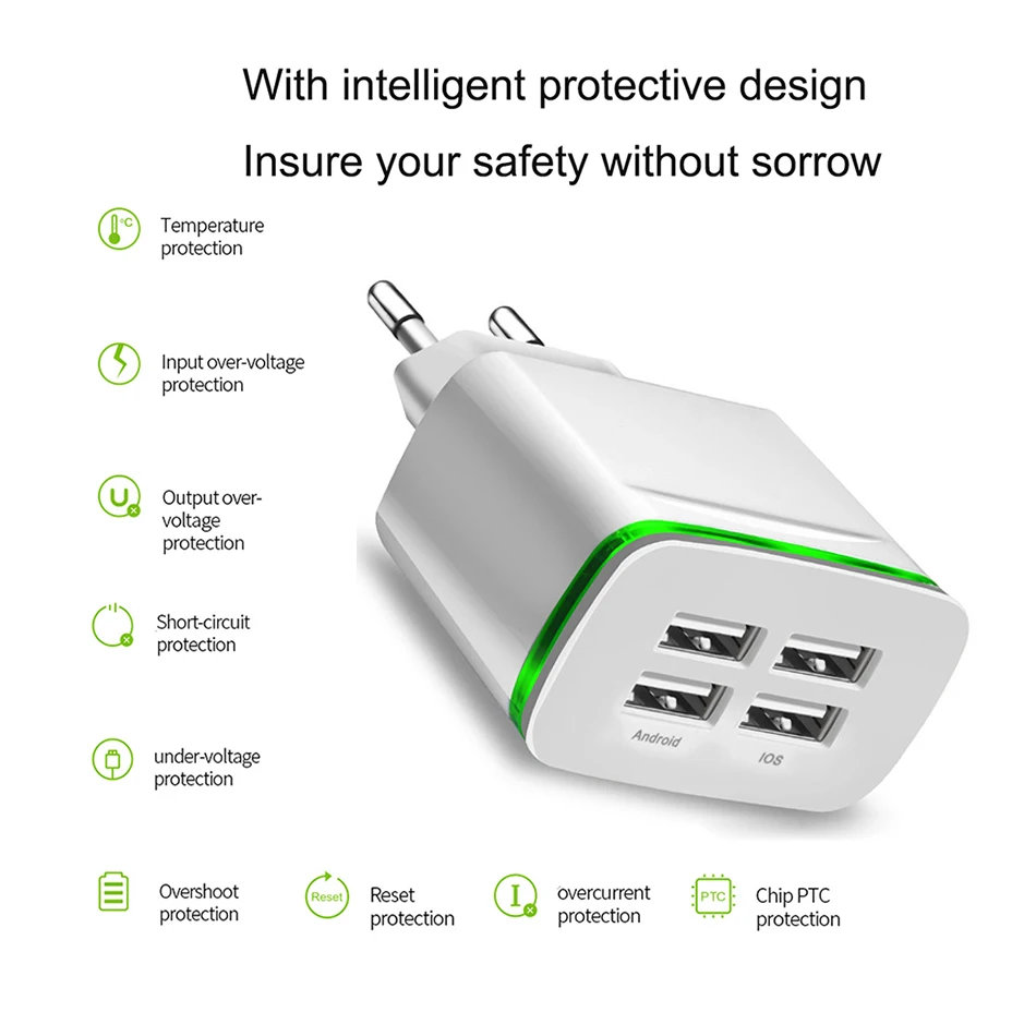 Caractéristique: 100% neuf et de haute qualité. Prise USB 4 ports, chargez 4 appareils simultanément. Idéal pour les voyages, à la maison ou au bureau. Offre une charge rapide et efficace. Haute efficacité et faible consommation d'énergie. Circuit de protection pour éviter la surcharge. Utilisez votre câble de charge/synchronisation USB existant pour le chargement. Format de poche, compact, léger, durable, facile à emporter partout. Il suffit de le brancher sur une prise murale et de le charger via un câble USB approprié. Pour l'utiliser avec n'importe quel périphérique USB, il suffit de connecter un câble USB à votre appareil puis au module chargeur, facile à utiliser. Compatible pour la plupart des périphériques d'enable USB, y compris pour Samsung, pour Apple pour iphone, pour iPod, pour Microsoft Zune, téléphone portable, PDA, appareil photo numérique/caméscope et plus encore.