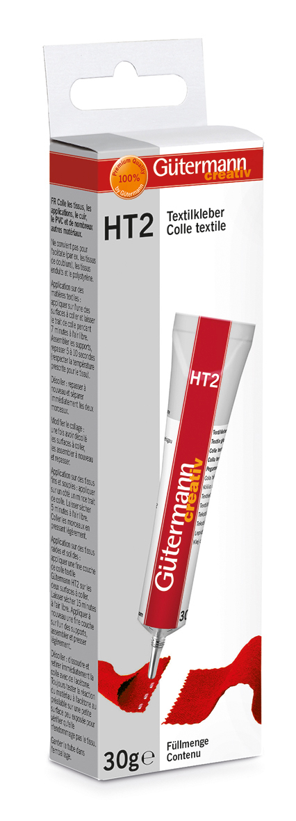 Super Textilkleber Gütermann HT2 zum Kleben von Leder, Stoffen, Kunststoffen, Gummi und vielem mehr. Durch die elastisch bleibenden Klebenähte ist dieser Textilkleber auch perfekt zum Anbringen von Applikationen geeignet. Er ist wasserfest und bis 40 °C waschbar. Eine Anleitung ist auf der Verpackung zu finden.