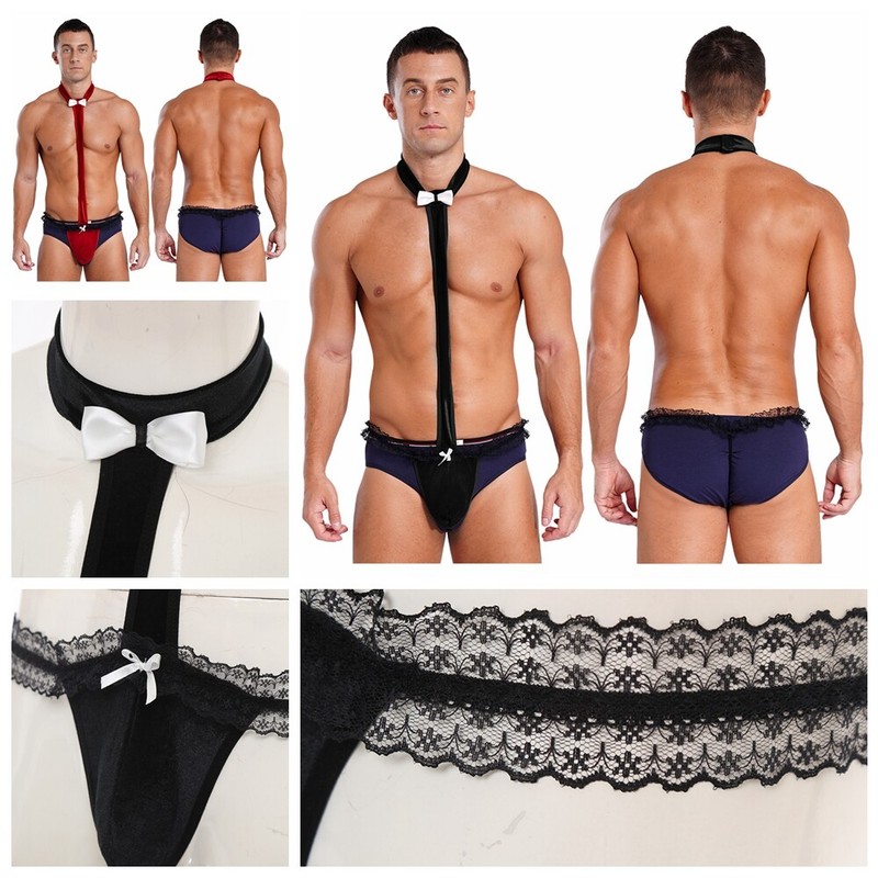 Novelty waiter tuxedo lingerie suit for men’s costume, includes a boxer briefs, one pair bracelets and a neck piece.
