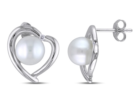 Jazz up your outfit with these Amour Collection Pearl and Diamond-Accent Heart Earrings. Mounted in lustrous sterling silver, they feature two 8-8.5mm white round freshwater cultured pearls and two round-cut, channel-set diamonds (G-H, I2-I3) forming a heart design. Polished to a brilliant shine, these stud earrings comfortably secure with butterfly closures. With a luminous white color, these pearl and diamond-accent earrings will complement everything in your closet.