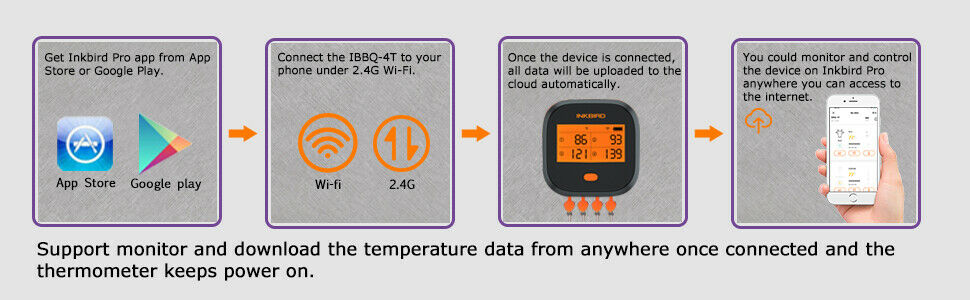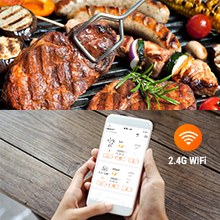 Download Inkbird Pro / BBQ-4T App, let this smoker grill thermometer connect with over 2.4GHZ Wi-Fi on your phone, you can monitor cooking temperature at any place as long as under the 2.4G Wifi circumstance. Even more, this wireless barbecue meat thermometer supports a multi-person sharing control function, which means, your family or friends can substitute control the cooking temperature when you are not available.