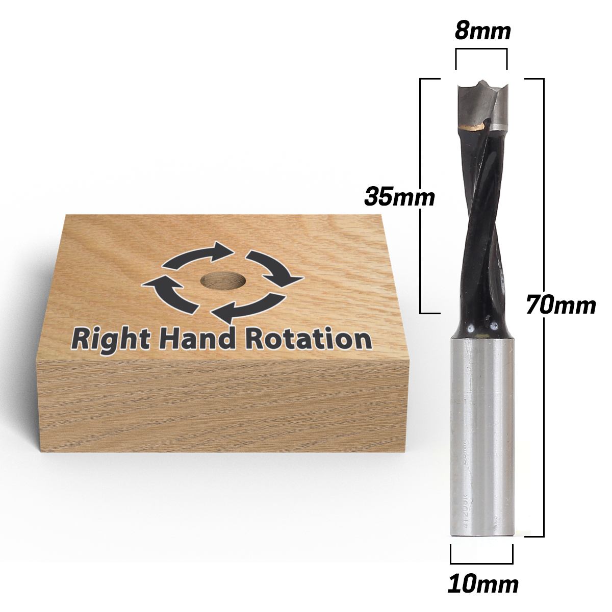 This right handed brad point boring bit has a 8mm diameter and a 35mm cutting depth. The shank is 10mm in diameter with a 20mm length. The shank also has a driving flat and a length adjustment screw.