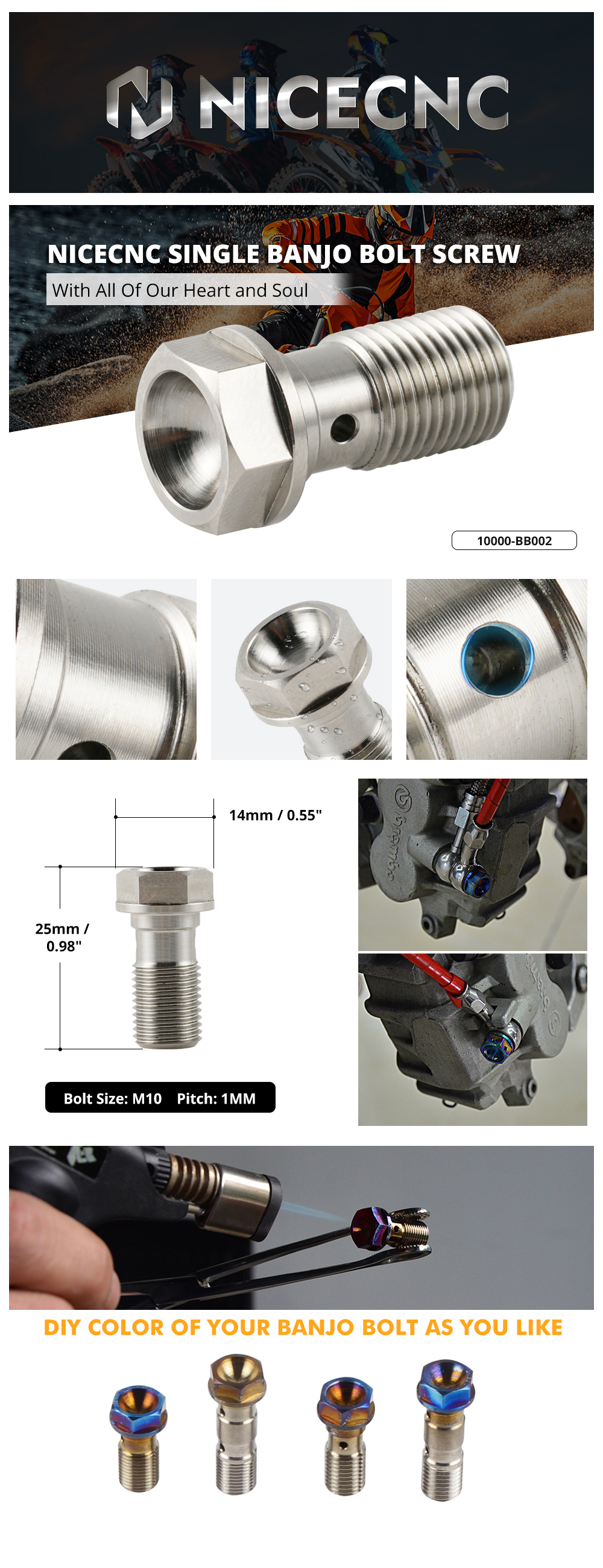 The Titanium can be change the color by heating, so you canDIYthe colorfor the banjo bolt. The picture shown can be the reference.