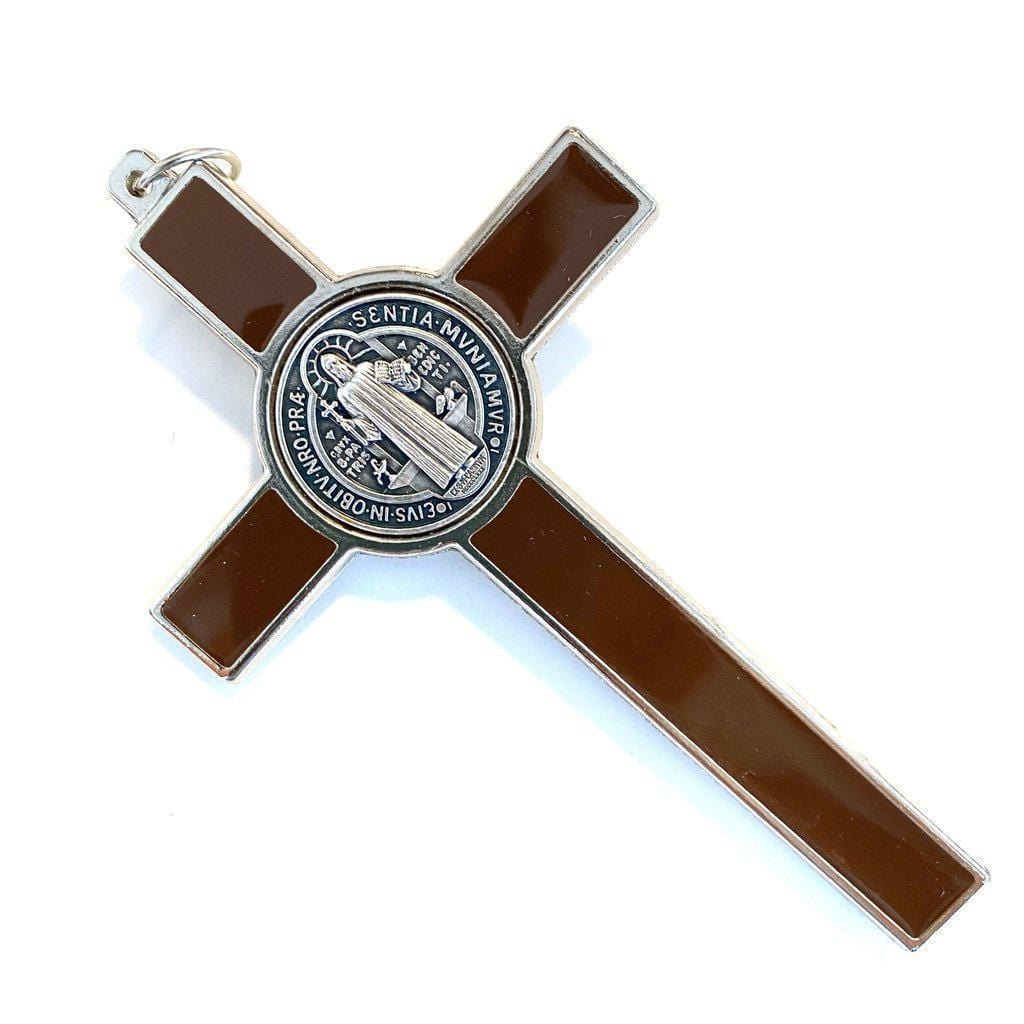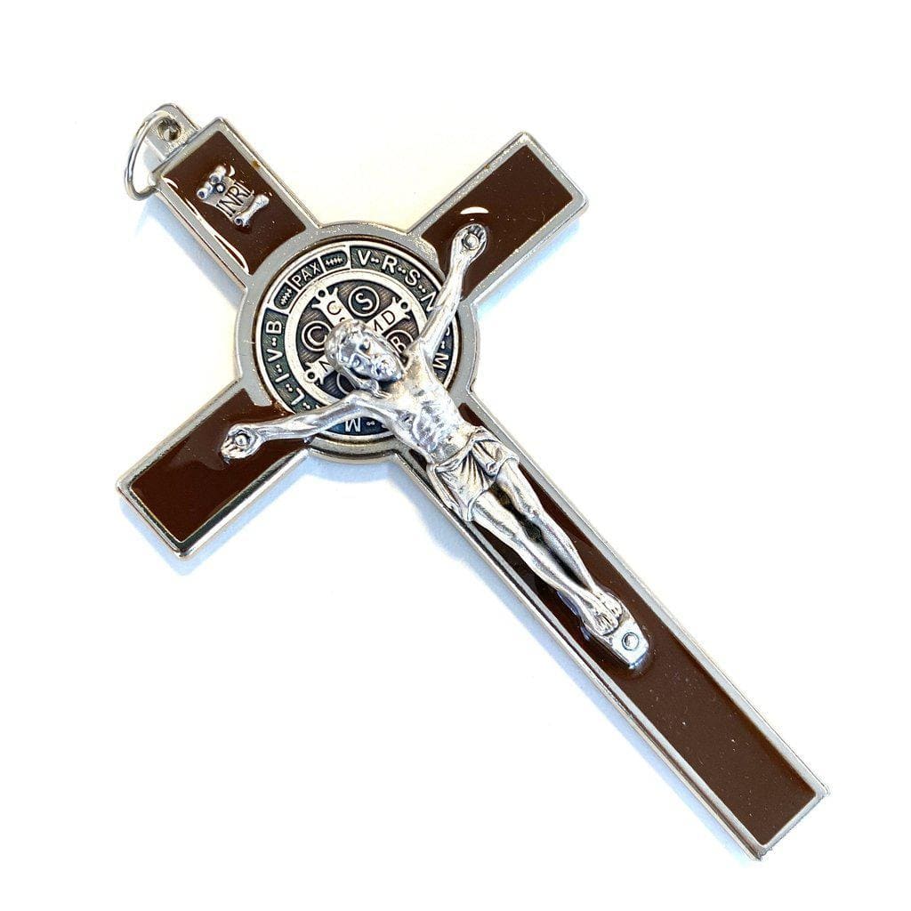 A big St. Benedict crucifix with great detail. The color is BROWN & silver-tone metal. Of course there is also the St. Benedict medal in the front and in the back of the crucifix. It's a fantastic cross.