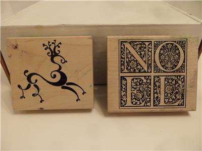 2 Wood Mounted Stamps: Reindeer 2208 G Judi Kins CRB & JJW USA Stamp, Noel Stamp Francisco inc MC 625-M Stamp.