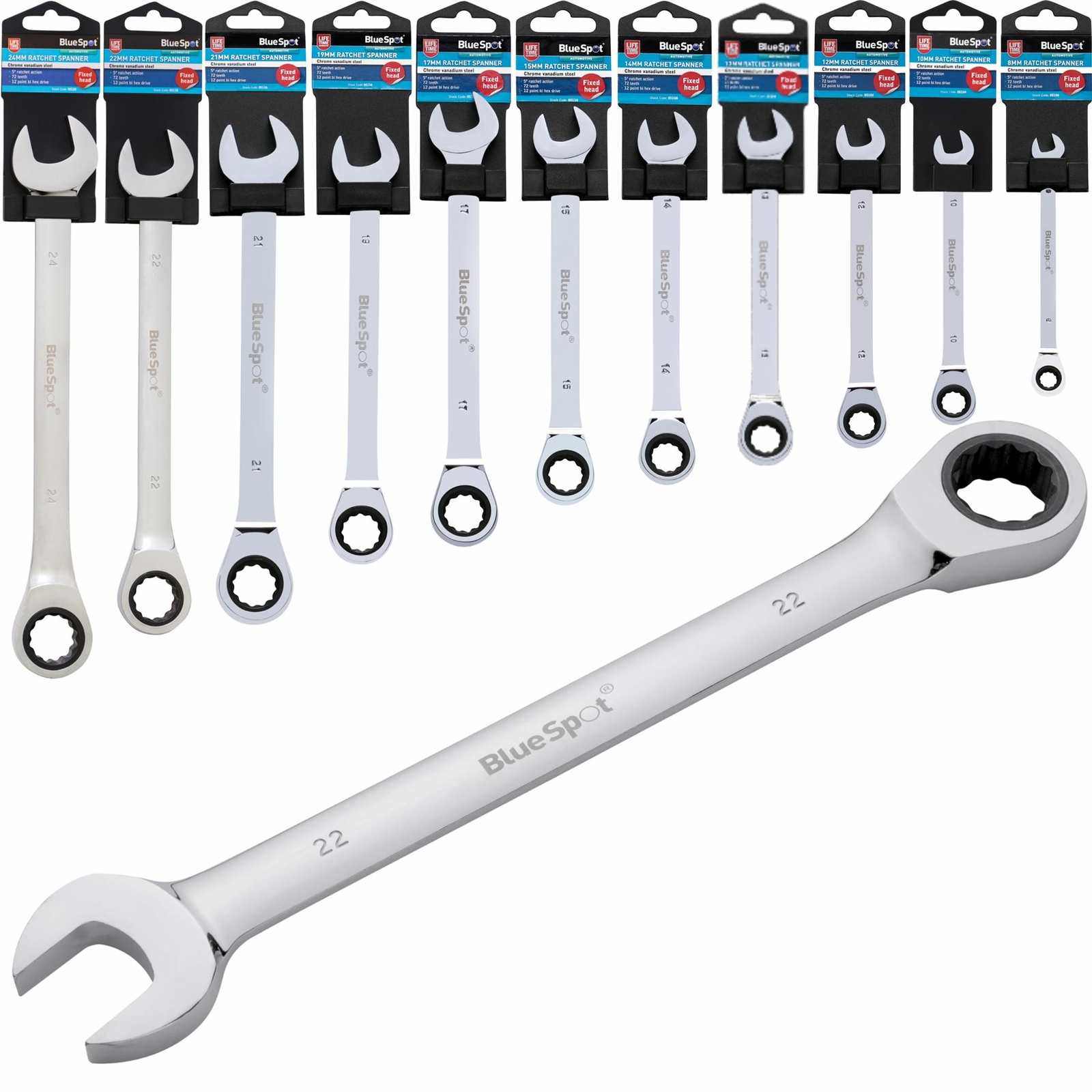 BlueSpot Ratchet Spanner Available In 8mm - 24mm Manufactured from chrome vanadium steel, heat treated and nickel plated for increased durability. The 5?? ratcheting increments make the ratchet spanner ideal for use in tight spaces. Fully polished mirror finish. 72 teeth 12 point bi hex drive Available in the following sizes Please choose from the drop-down menu for the size spanner that is required. To activate the manufacturers lifetime guarantee, you will need to register the product on the Bluespot website within 30 days of purchase. BlueSpot Ratchet Spanner Available In 8mm - 24mm Manufactured from chrome vanadium steel, heat treated and nickel plated for increased durability. The 5?? ratcheting increments make the ratchet spanner ideal for use in tight spaces. Fully polished mirror finish. 72 teeth 12 point bi hex drive Available in the following sizes Please choose from the drop-down menu for the size spanner that is required. To activate the manufacturers lifetime guarantee, you will need to register the product on the Bluespot website within 30 days of purchase.