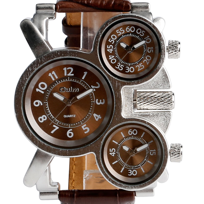 Oulm Quartz Watches 3 Time Zone Big Face Dial Leather Strap Steel Case Watch