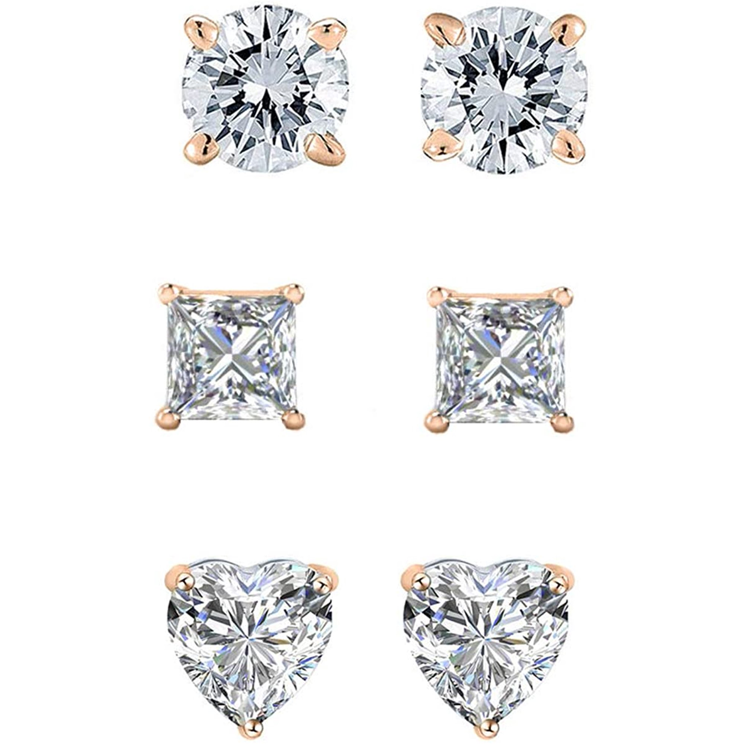3 Pair 6mm 14K Rose Gold Plated CZ Princess, Round & Heart Cut Stud Earrings