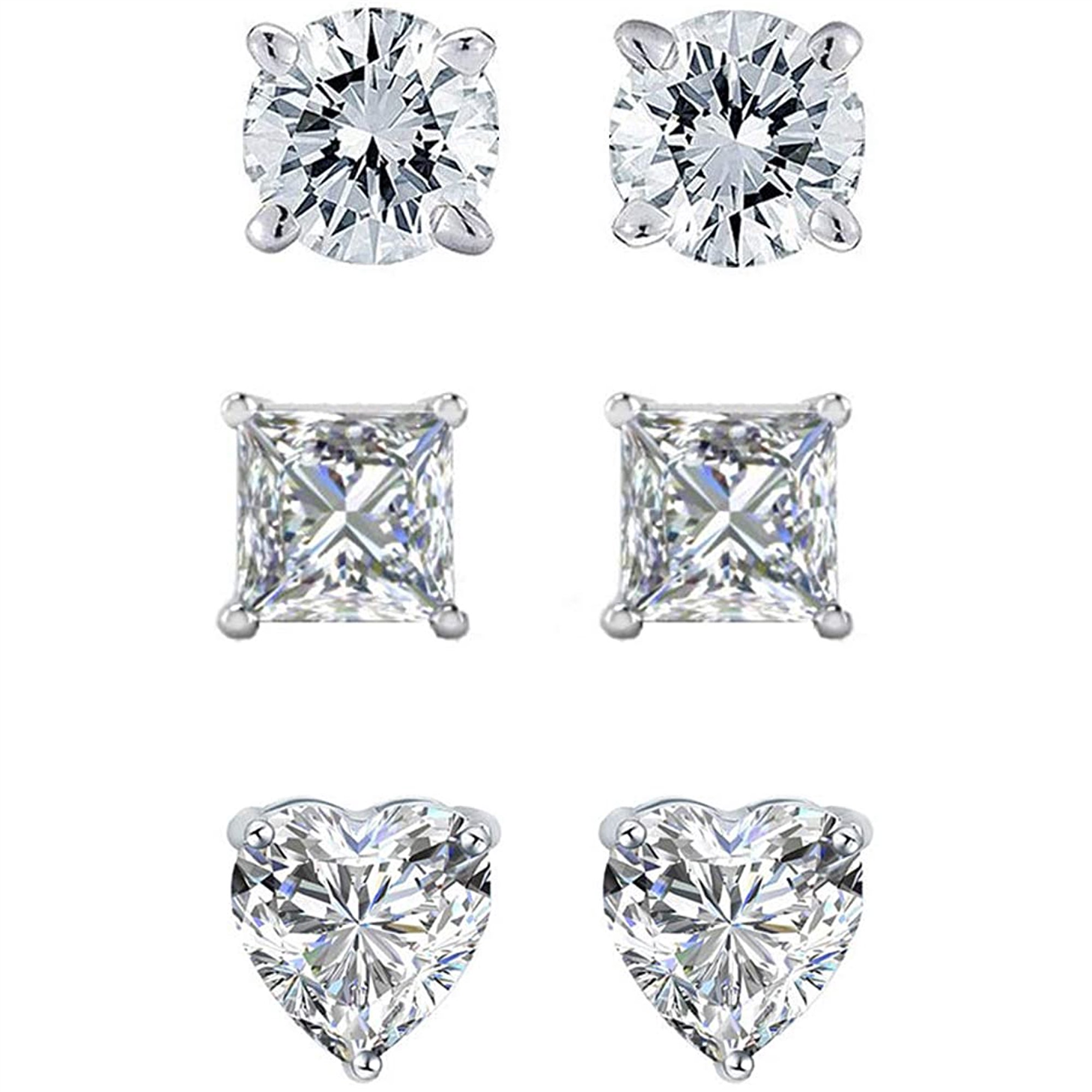 3 Pair 8mm 14K White Gold Plated CZ Princess, Heart & Round Cut Stud Earrings