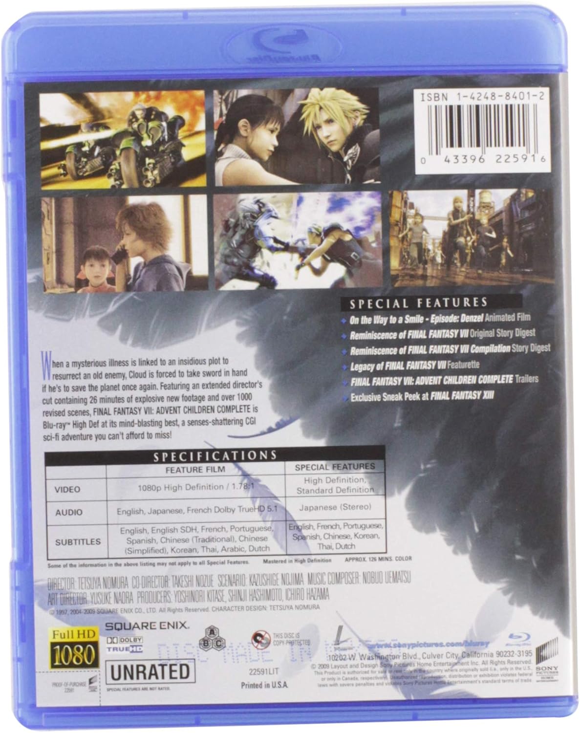 Continuing the storyline based on the hit Playstation game Final Fantasy VII, two years have passed since the ruins of Midgar stand as a testament to the sacrifices made in order to bring peace. However, the world will soon face a new menace. A mysterious illness is spreading fast. Old enemies are astir. And Cloud, who walked away from the life of a hero to live in solitude, must step forward yet again . . . 2016 release: Two years have passed since peace was won, and the ruins of Midgar stand as a testament to the sacrifices made to win that battle. But when a mysterious illness is linked to an insidious plot to resurrect an old enemy, Cloud must choose between the life of solitude he committed to or taking up the sword once more to save the planet he so loves. Featuring an extended director's cut containing 26 minutes of explosive additional footage and over 1,000 revised scenes, Final Fantasy VII: Advent Children Complete is BluRay High Def at it's mind-blasting best, a senses