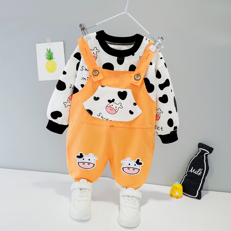 Matching with buttons suspender pants, pockets front, cow print outfits.